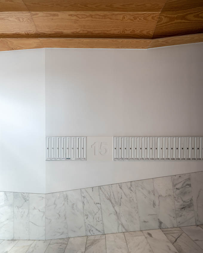 Para ello se bajó la cota de acceso a los ascensores, adecuando rampas y escaleras. Se creó un zaguán de acceso cubierto, con una nueva fachada más luminosa y se renovaron por completo los acabados siguiendo criterios de durabilidad y facilidad de mantenimiento: mármol blanco en zonas susceptibles de impacto y un falso techo de madera de pino que equilibra la frialdad del mármol.